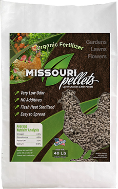 Crop NutritionMissouri Pellets produces pelletized organic fertilizer made from chicken manure for organic crop farmers in Missouri and throughout the midwest. Chicken litter pellets are convenient to use and transport while providing a valuable source of nutrients and organic matter for your crops. The average analysis is 2-4-3 with 11% Ca. Our pellets have very consistent moisture, are flash heat sterilized, free of weed seeds, and easy to handle. Pellet size is 1/4 inch.